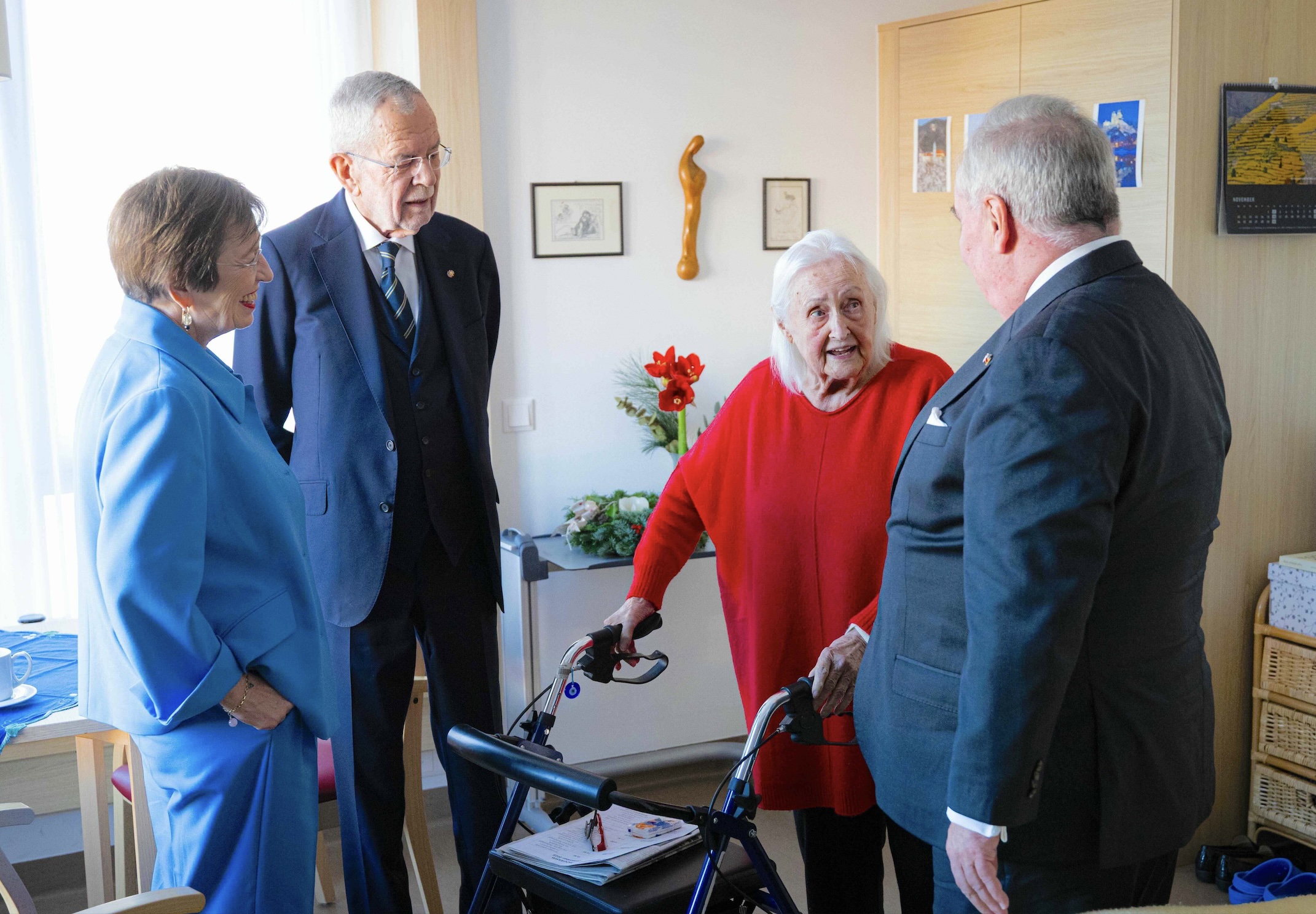 Bundespräsident Van der Bellen, First Lady Mag. Doris Schmidbauer und der Großmeister des Malteserordens, Fra’ John T. Dunlap, erkundigten sich im Gespräch mit Bewohnerinnen und Bewohnern des Pflegewohnhauses „MALTESER Ordenshaus“ über wichtige Aspekte der Lebensqualität im Alter. Fotocredit: © Souveräner Malteser-Ritter-Orden – Christian Lendl